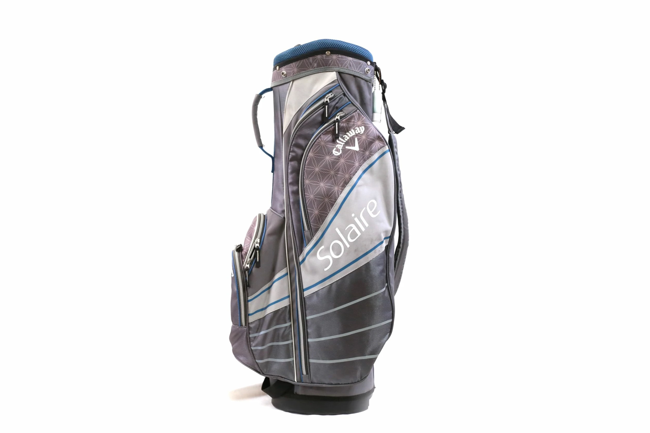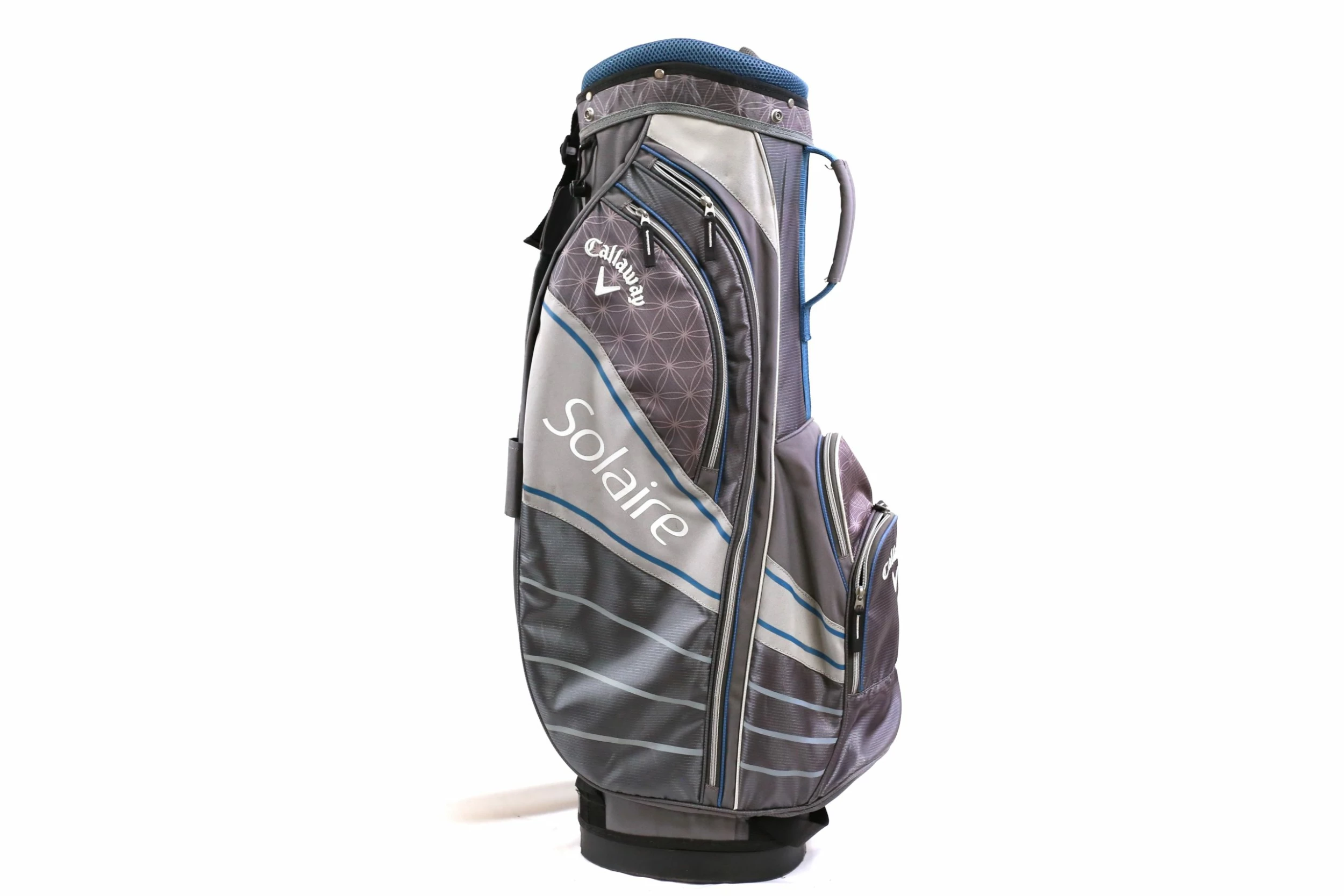 EXCELLENT – This Callaway Solaire Cart Bag is in excellent condition with very minor wear from use. There is minimal dirt and staining on this bag from handling. There are also minimal signs of tearing among the dividers and near the pockets. This bag Comes with 8 dividers, and 7 pockets and features with zippers that all function well. Please see the pictures provided for more details.