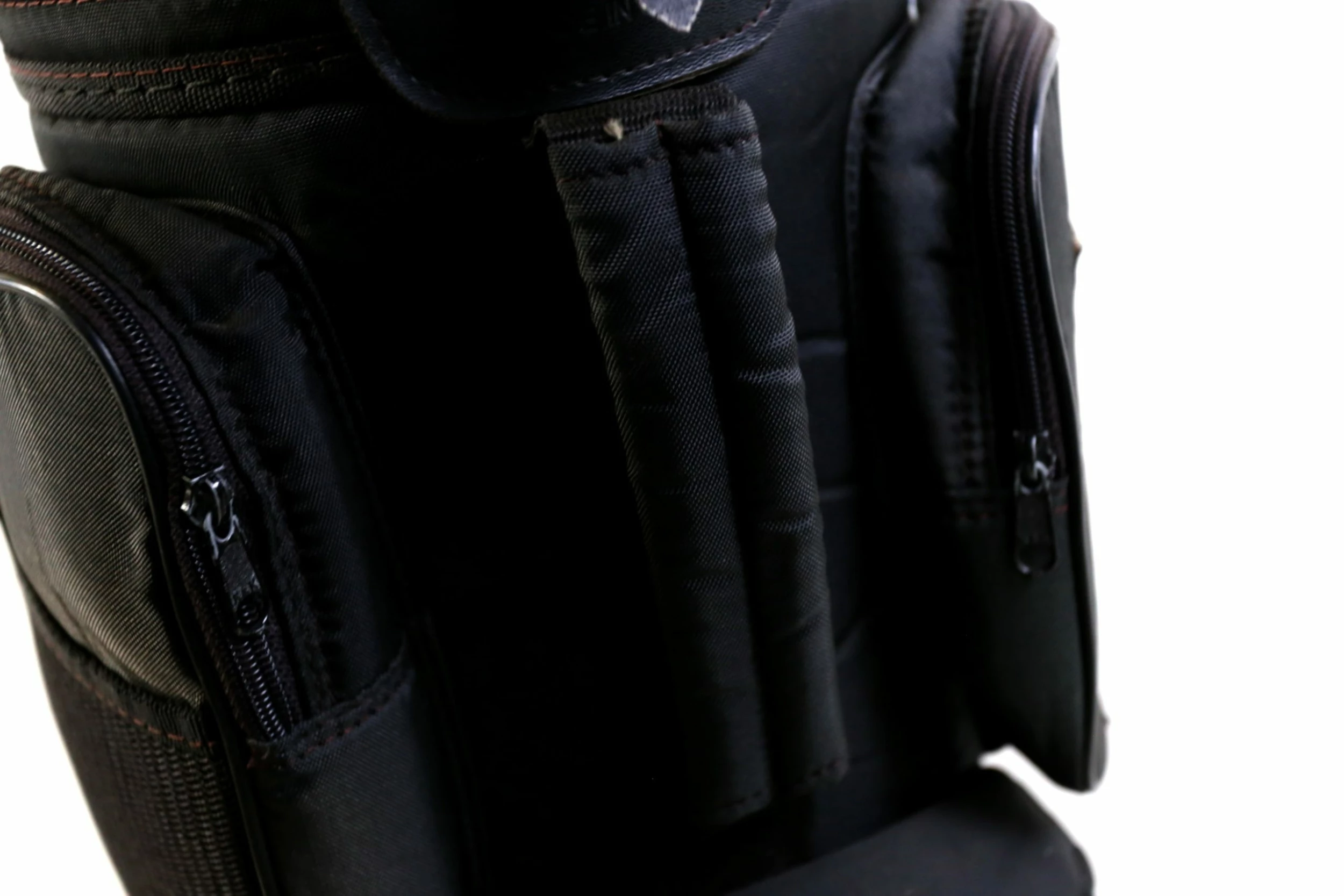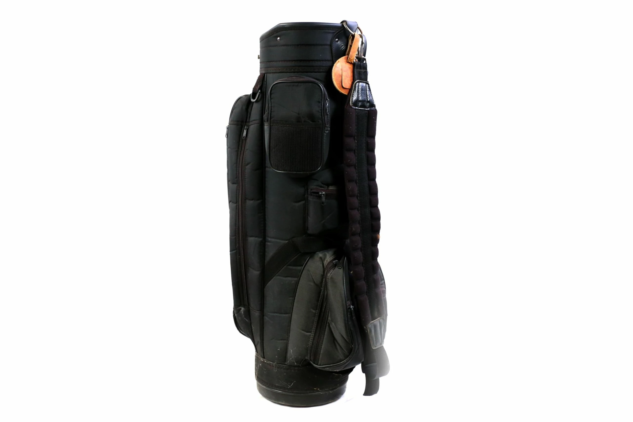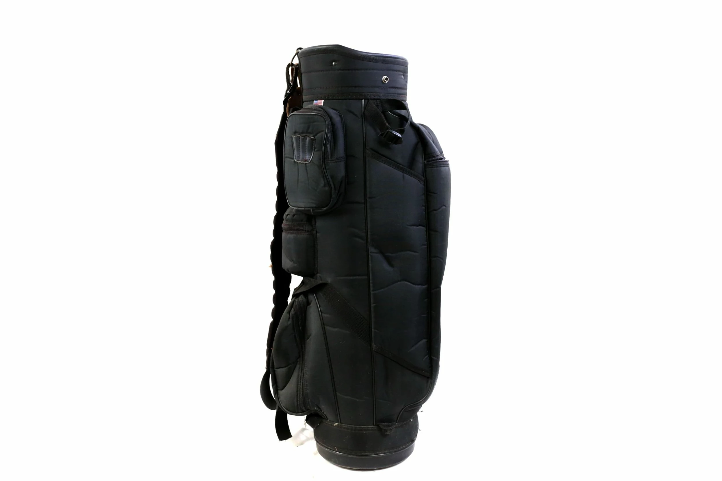 VERY GOOD – This Macgregor Black Cart Bag is in very good condition with very minor wear from use. There is minimal dirt and staining on this bag from handling. There are also minimal signs of tearing among the dividers and near the pockets, but the dividers do some some signs of wear with scratching visible. This bag mainly made of nylon, comes with 6 dividers, 6 pockets with zippers that all function well. Please see the pictures provided for more details.
